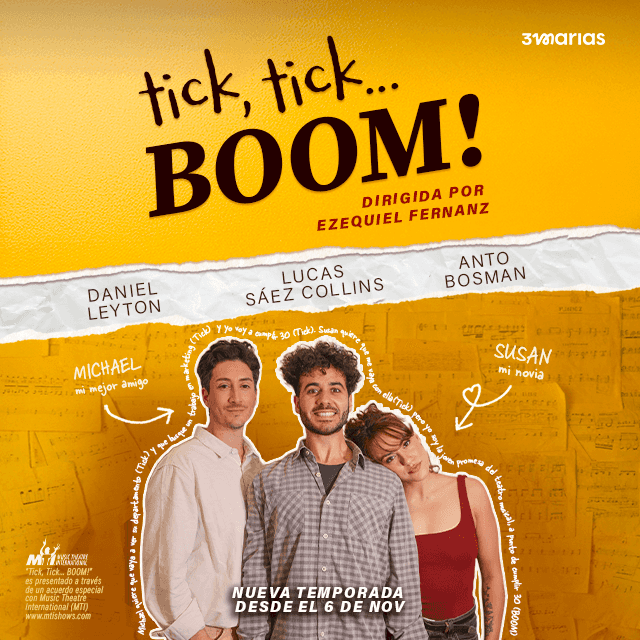 Dirigido por Ezequiel Fernanz y producido por 3 Marías Producciones, Tick, ¡Tick… Boom! es un viaje vibrante sobre el amor, la amistad, el miedo al fracaso y la pasión por crear, con canciones inolvidables que han conquistado a generaciones en Broadway y ahora brillan en Chile.